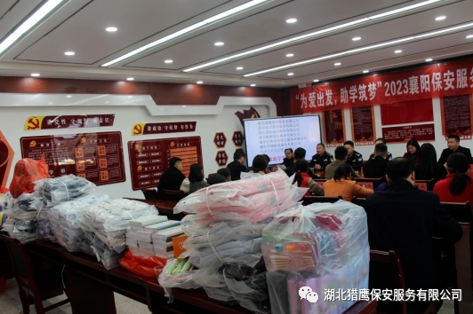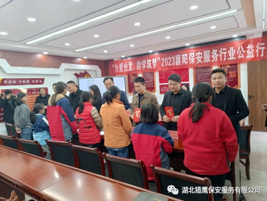 2023年11月24日在襄陽(yáng)市公安局保安監(jiān)管大隊(duì)的帶領(lǐng)下,湖北獵鷹保安服務(wù)有限公司聯(lián)合襄陽(yáng)其他保安服務(wù)行業(yè)一行7個(gè)單位走進(jìn)保康縣店埡鎮(zhèn)兩所學(xué)校,為貧困學(xué)生送去了資助金和一批書籍、文具、書包等物資。